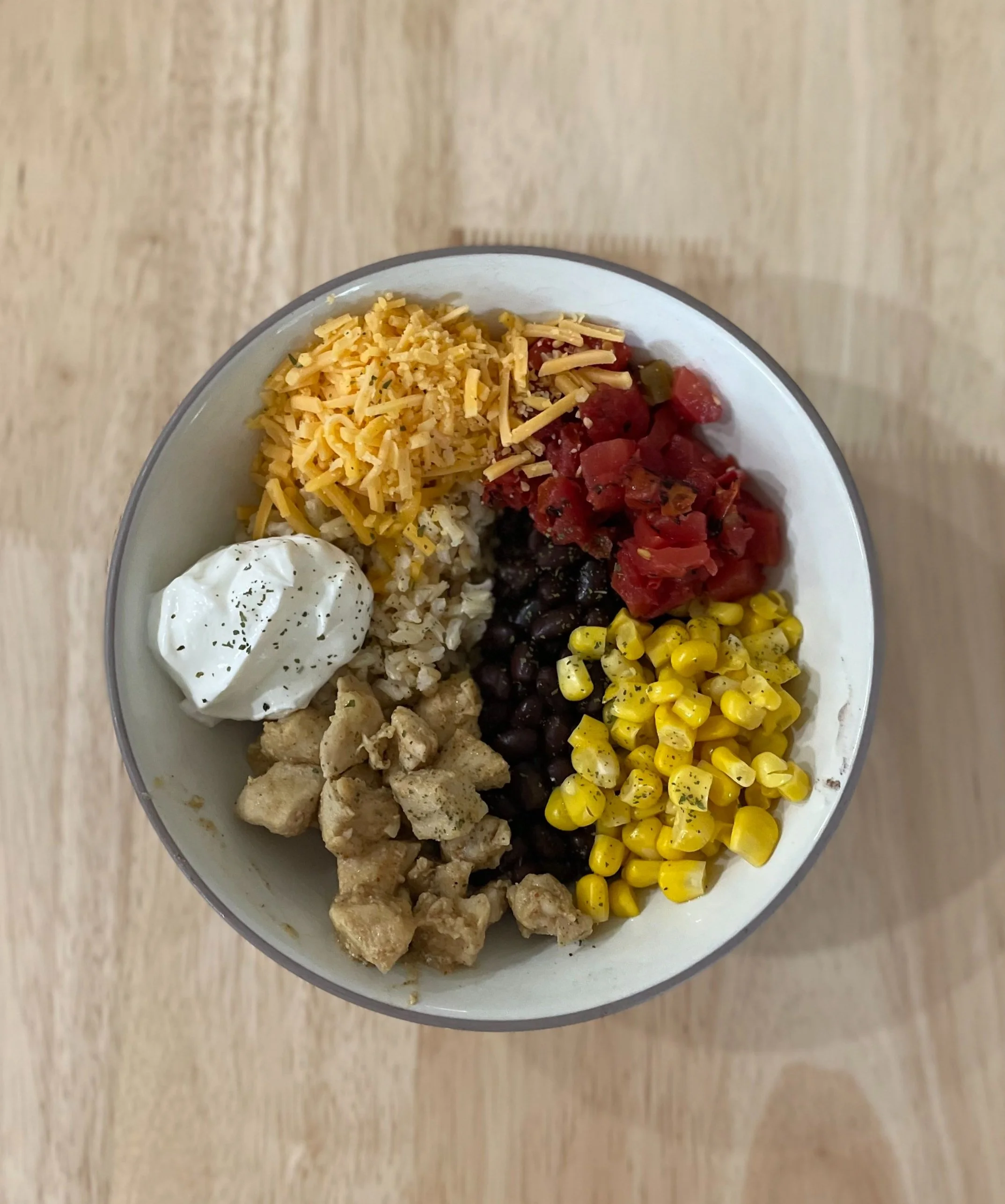 This is almost an all-pantry meal; brown rice, a can of corn, a can of rotel, and a can of black beans. I can make a game-time decision whether I want to do shredded chicken, chorizo, or ground meat from my freezer, and we always have sour cream, salsa, and shredded cheese in the fridge.